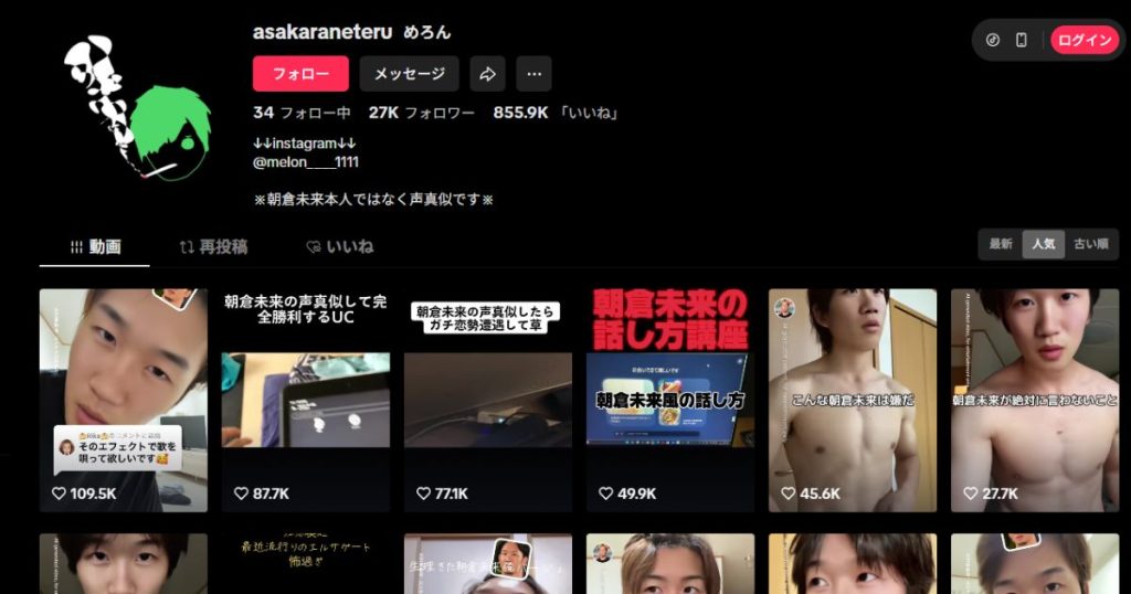 『めろん』さんは、格闘家『朝倉未来』さんの声真似をする人気TikTokerです。