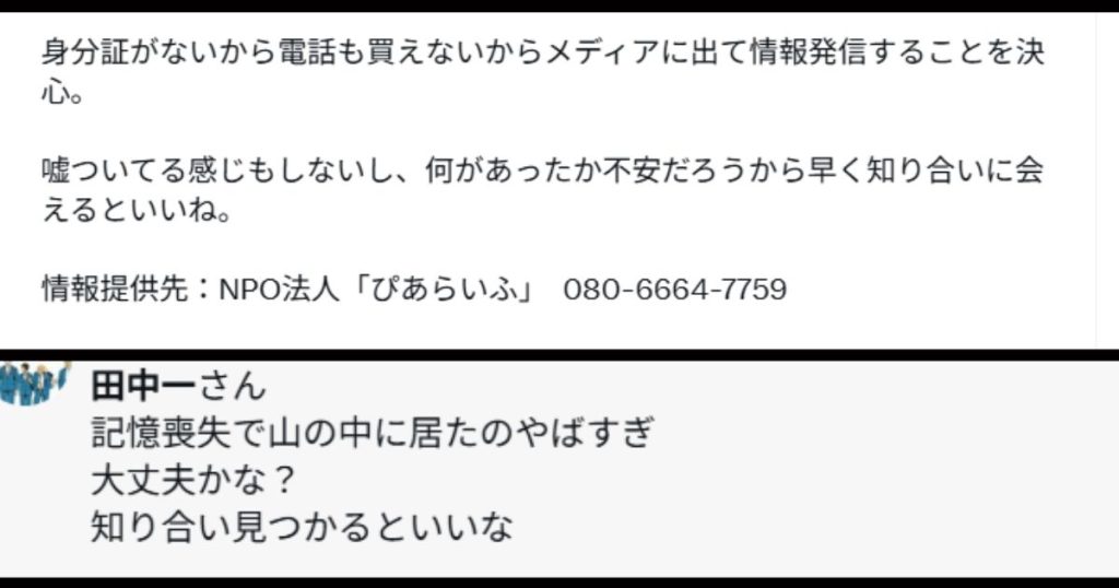 ・記憶が戻らないとして田中一(仮名)がメディアを通じて自分の身元を探している