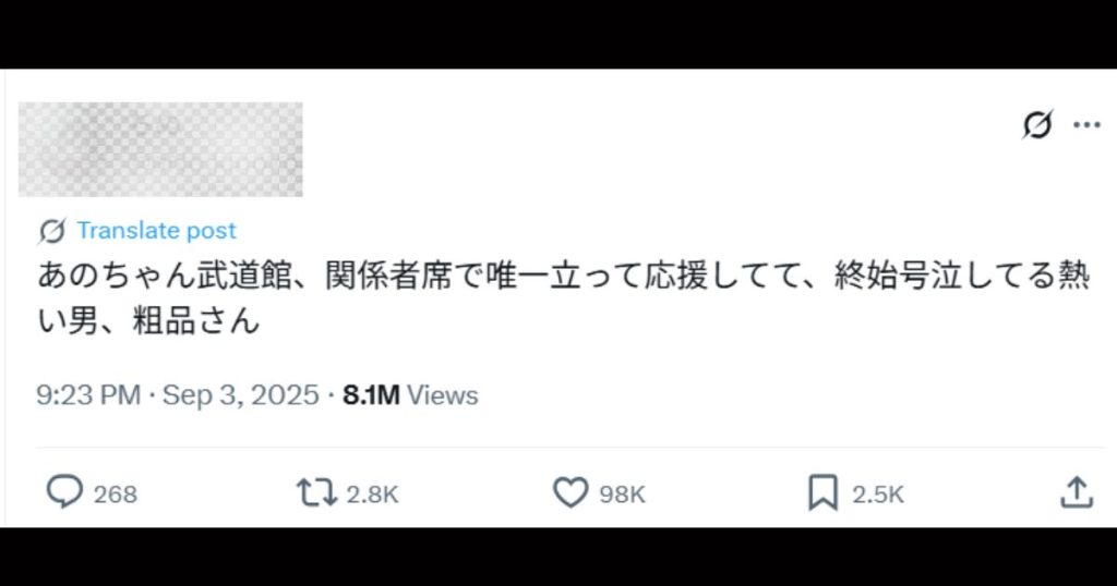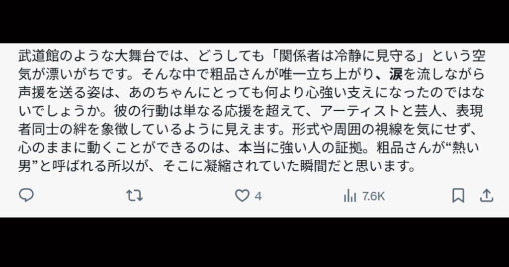 あのちゃんの武道館ライブで、関係者席で唯一立って終始号泣してた粗品さんが現在大きな話題になっています。