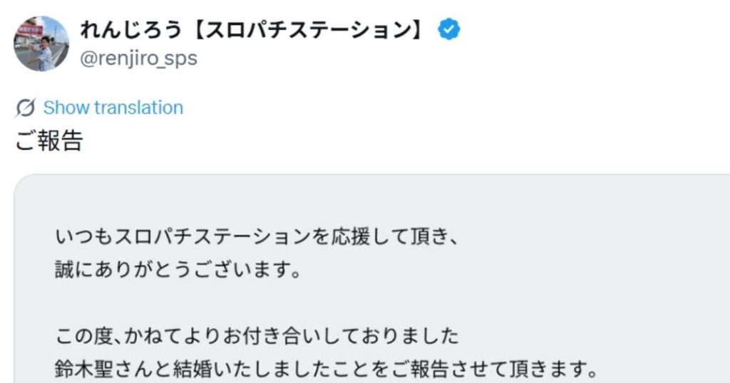 スロパチステーションの演者れんじろうさんが、2026年3月6日に自身のSNSで結婚の報告を致しました!